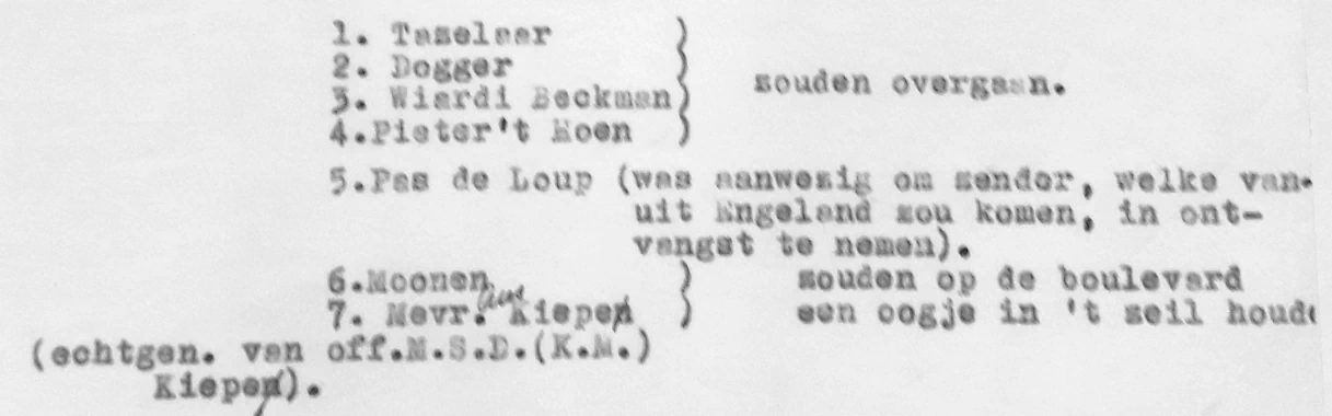 Dogger, 1946: ‘Moonen had als politie inspecteur vergunning om de boulevard te betreden, zodat hij zich vrij kon bewegen en niemand hem beletten zou met zijn “geliefde” (mevr. Kiepe) op de boulevard te wandelen.’ Aan het gezelschap was journalist Frans Goedhart toegevoegd, die Dogger kende onder zijn pseudoniem Pieter ’t Hoen. Hij had zich min of meer opgedrongen. Overtuigd dat dit zijn kans was om in Londen zijn verhaal te doen, had hij via de radioverbinding van Aart Alblas in Engeland om toestemming gevraagd om mee te mogen.